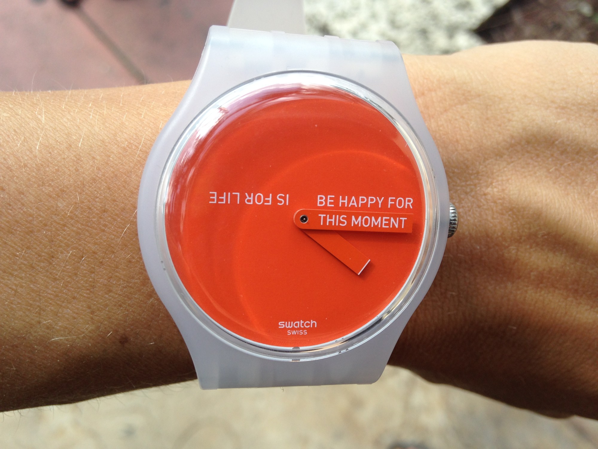 From my recent lamenting about the phone AKA digital hand watch, Rick pulled me into Swatch to get a new casual, everyday watch. I was joyful to discover a new friend, not only a watch but, a mantra. It provides me constant remembrances – “Be Happy for this Moment” and “This Moment is for Life”.